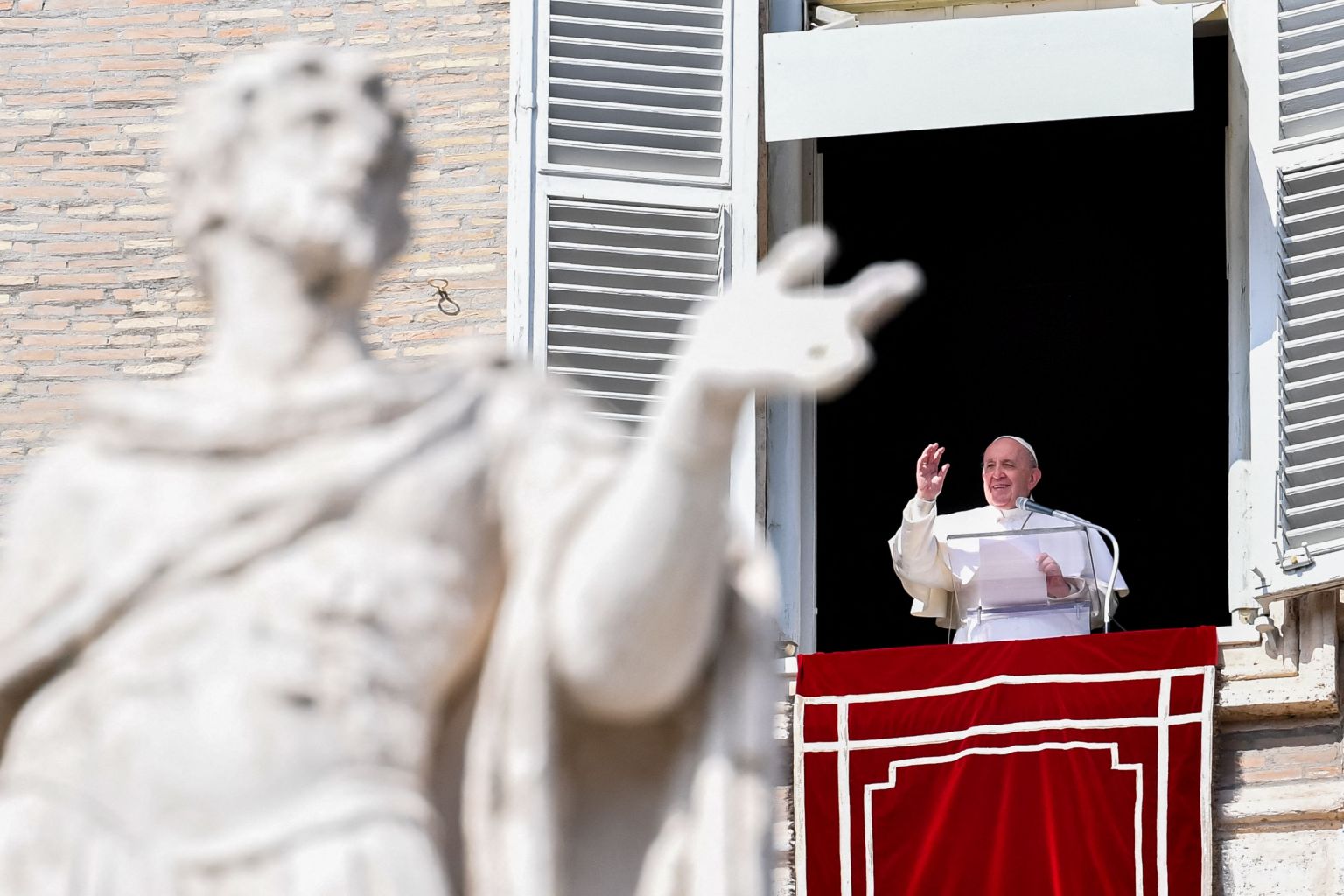 Pope Francis waves during prayers from a window of the apostolic palace overlooking St Peter's square in the Vatican City in February 2021.