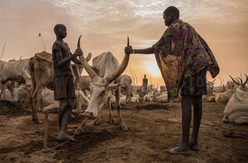 Sudanese boys from Dinka tribe take care of a cow at their cattle camp in Mingkaman on March 3, 2018.