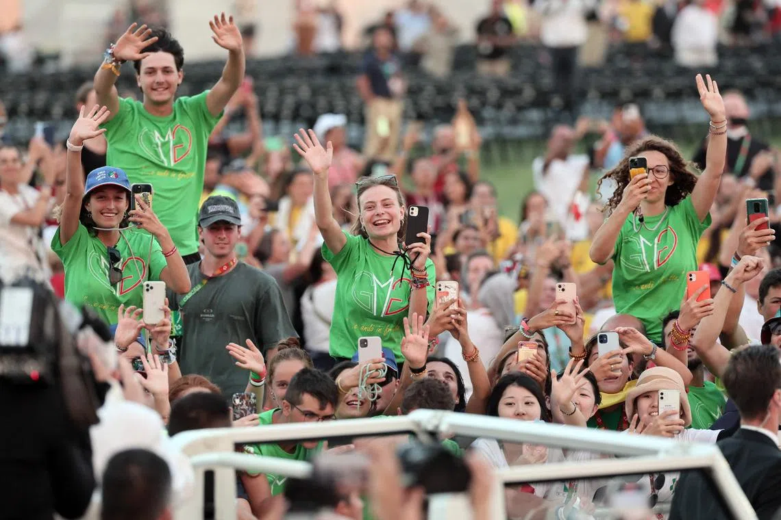 Pilgrims waving to the pope as he arrives for the World Youth Day vigil in Lisbon.