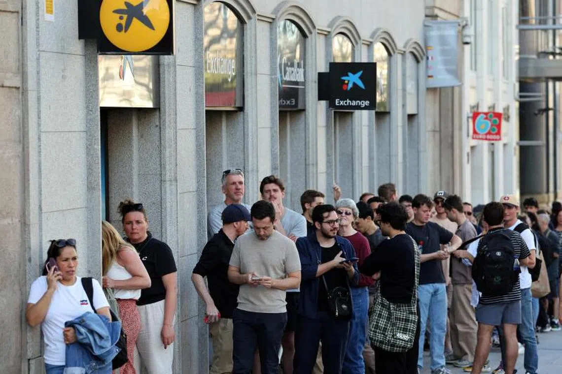 People queue to try to withdraw cash money at an ATM in Madrid as credit card payment is unavailable due to a massive power outage.