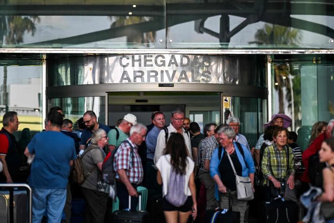 People with their luggage wait outside Humberto Delgado airport following a general electricity shutdown in Lisbon on April 28, 2025. Power went out across all of Spain and Portugal today, cutting cellphone and internet networks, halting trains and trapping people in elevators, officials said. (Photo by Patricia DE MELO MOREIRA / AFP)