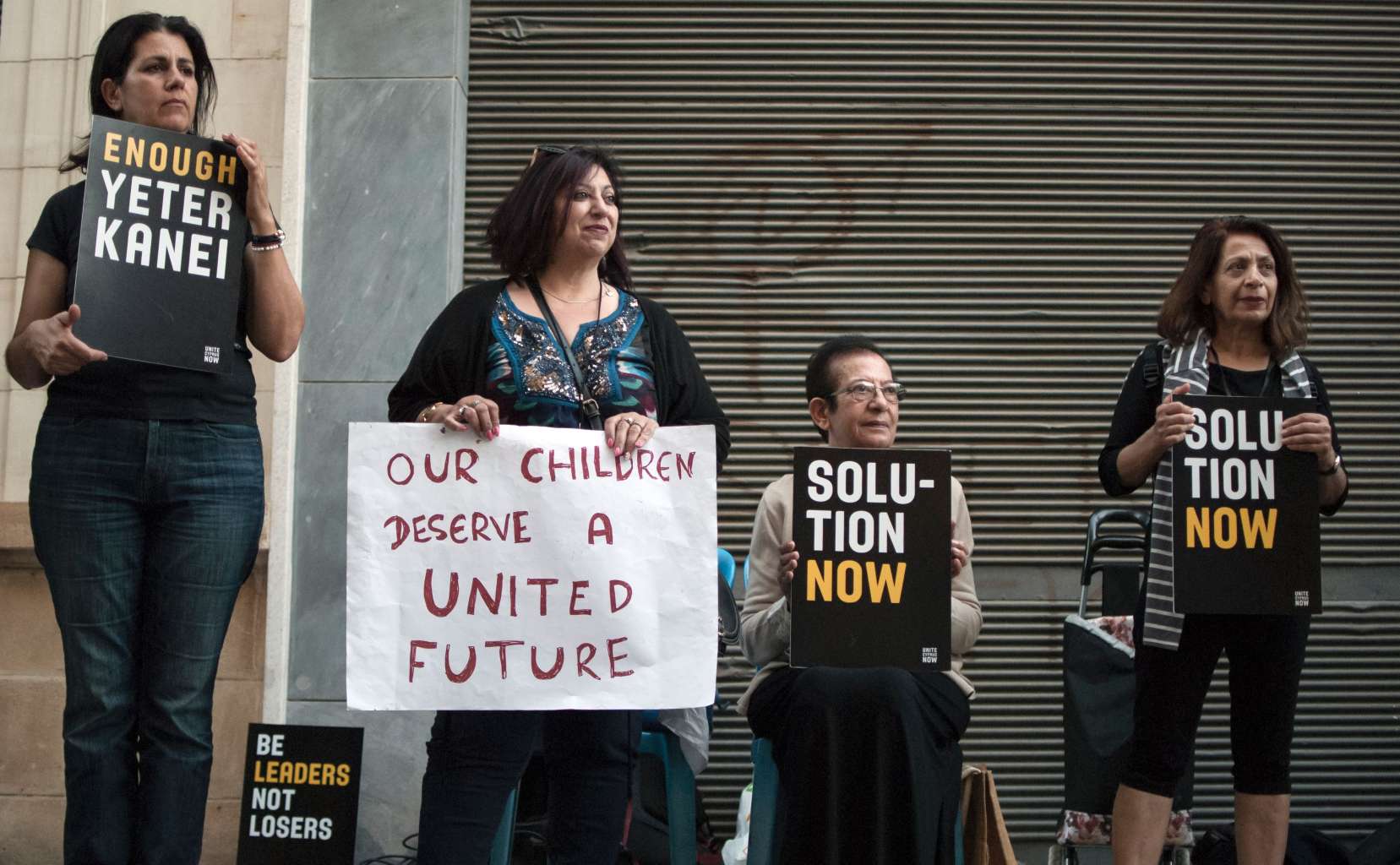 Turkish- and Greek-Cypriot protesters demand unification outside the UN-controlled buffer zone in Nicosia.