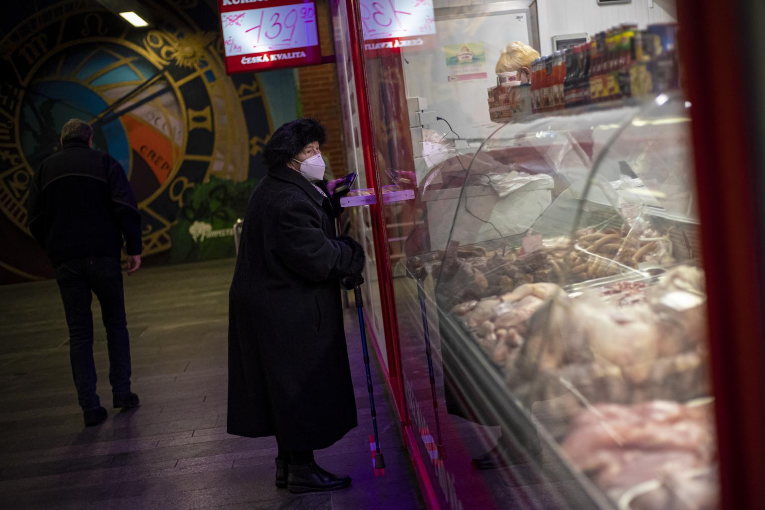 A woman buying meat from a butcher in Prague on Jan 12, 2021.