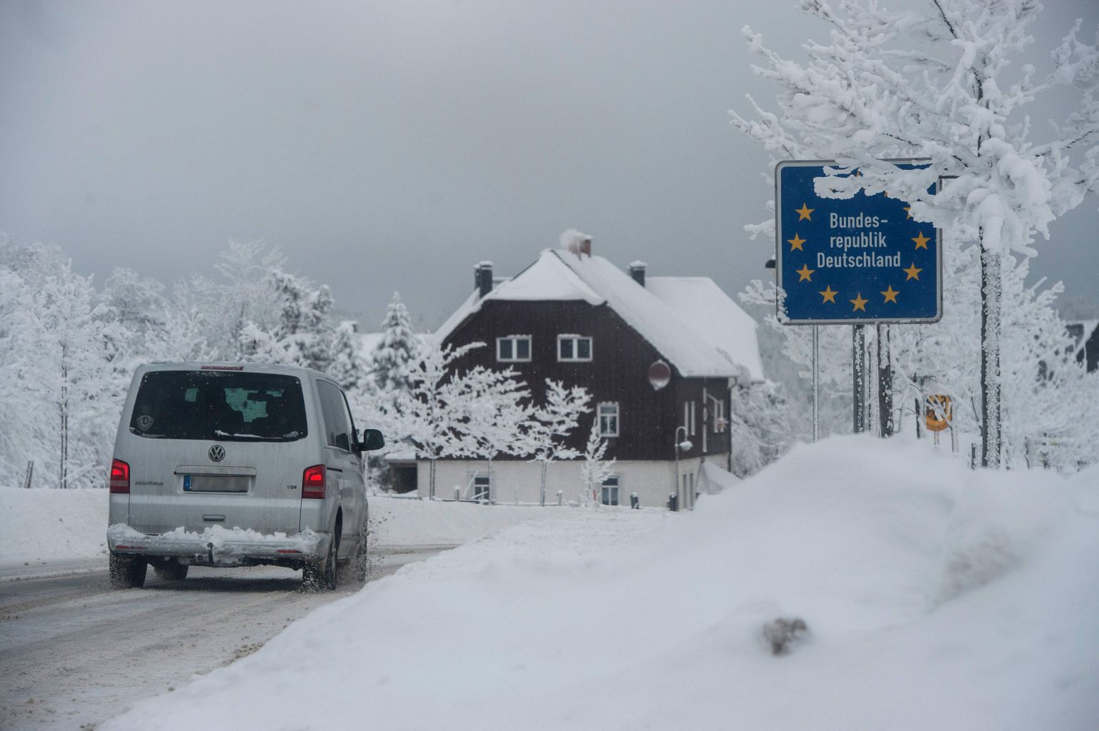 A car with a German number plate crosses the Czech-German border in Cinovec, near Teplice, in the Czech Republic, on Feb 13, 2021,