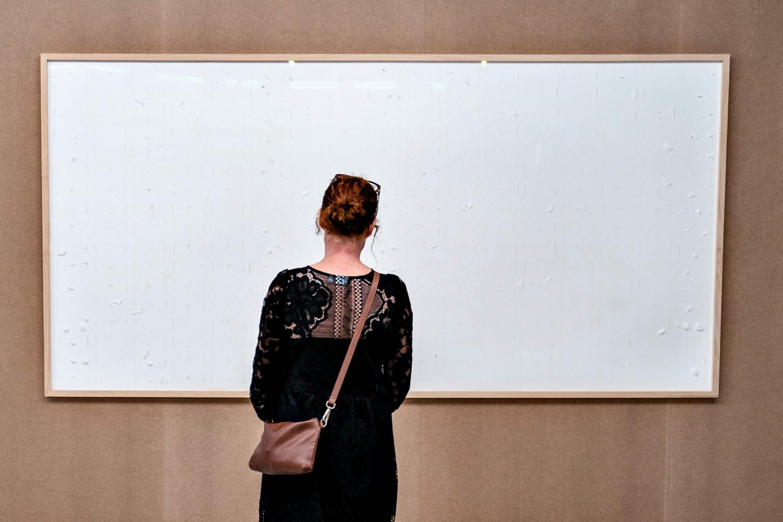 A woman looking at Take The Money And Run by artist Jens Haaning at the Kunsten Museum, in Denmark, on Sept 28, 2021.
