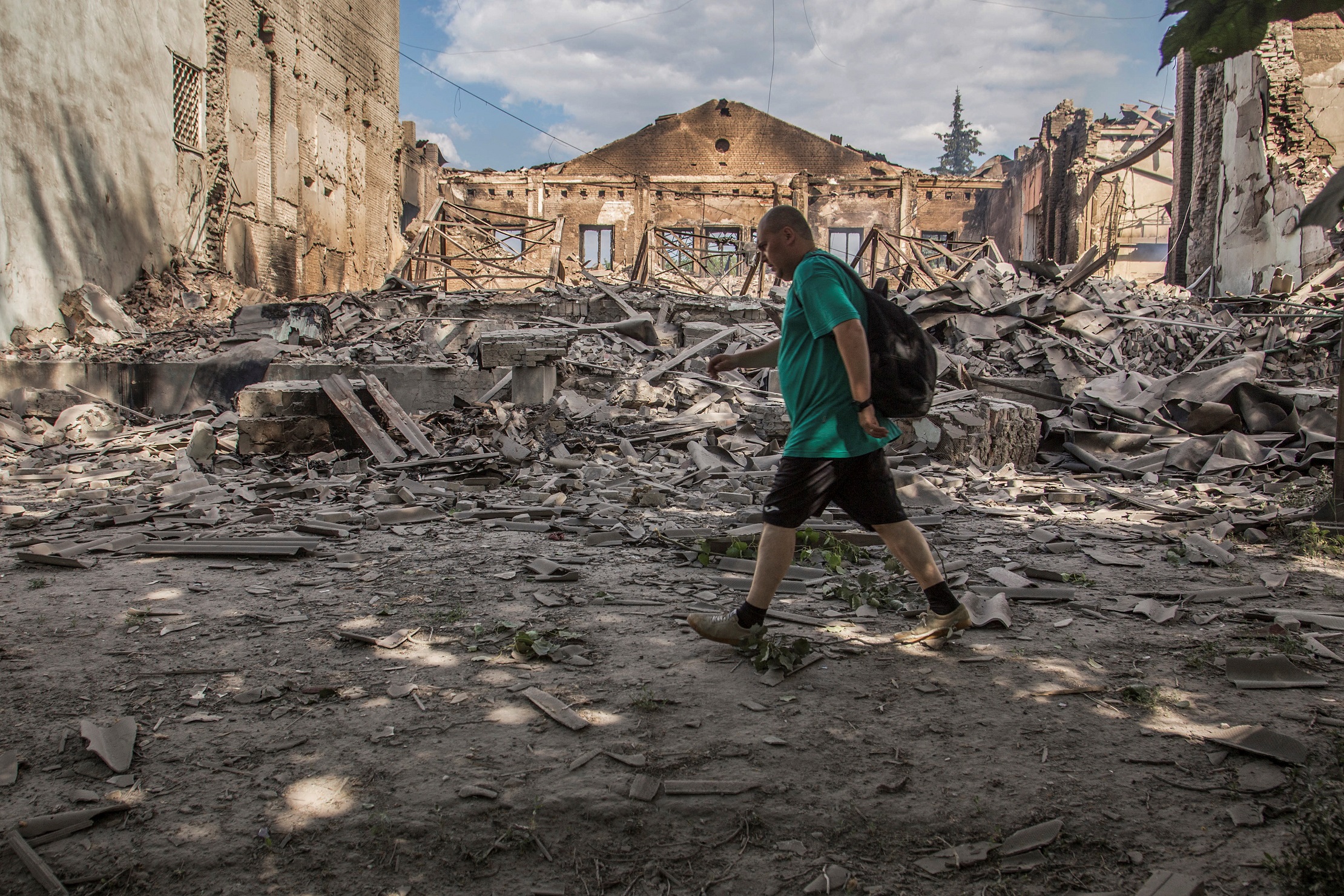 A local resident walks in a front of a building destroyed by a military strike, in Lysychansk, in Ukraine's Luhansk region, on June 17, 2022.