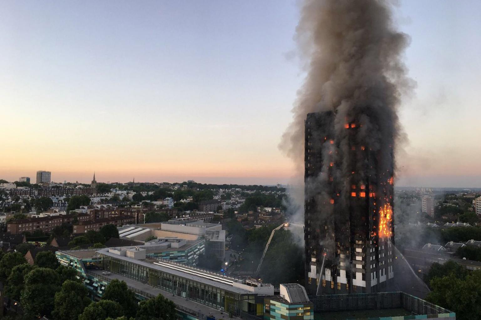 Flames and smoke emitting from a 27-storey block of flats after a fire broke out in Grenfell Tower, west London on June 14, 2017.
