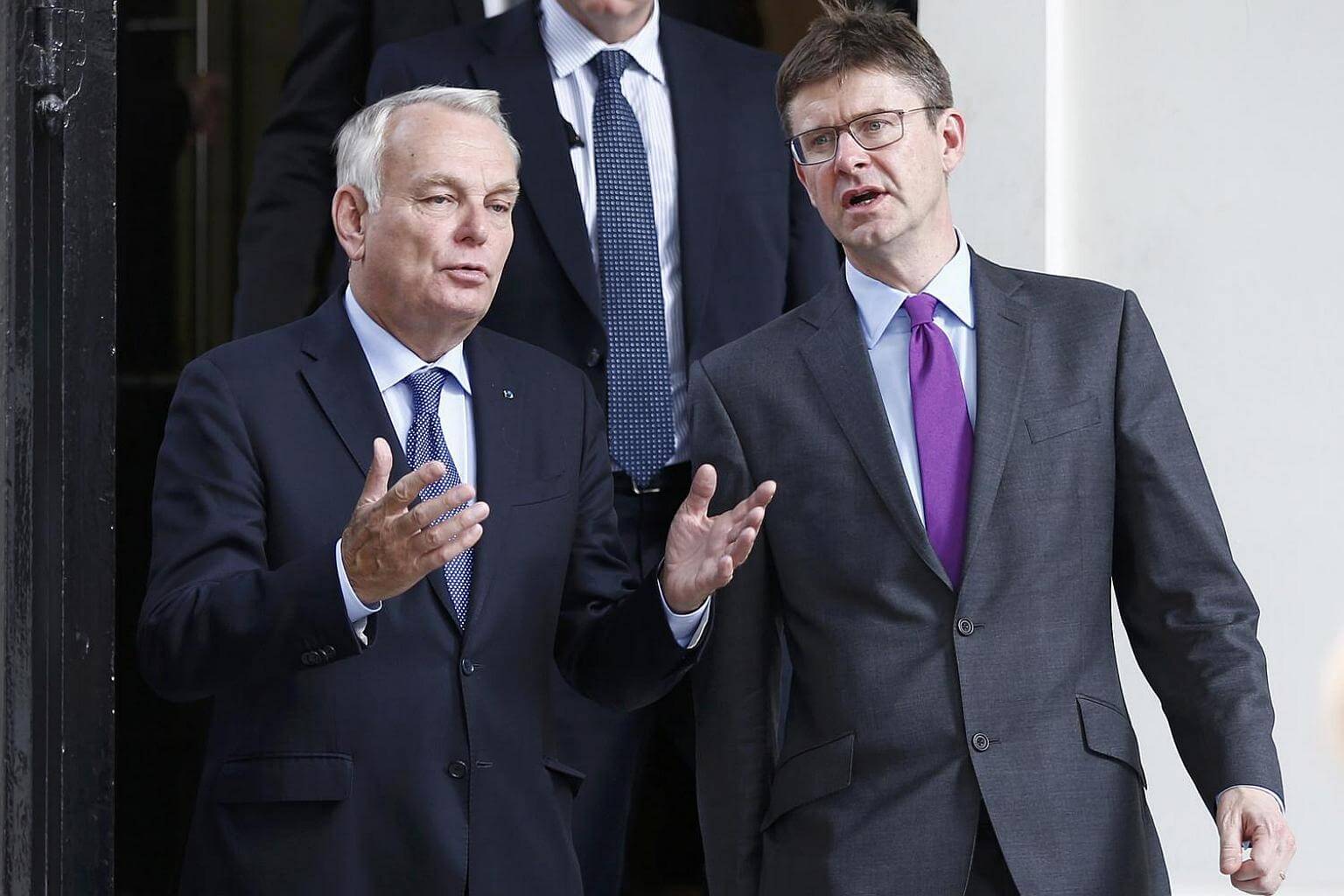 France's Foreign Minister Jean-Marc Ayrault (left) and Greg Clark Britain's Secretary of State for Business leave 10 Carlton House Terrace in central London on Sept 29, 2016.