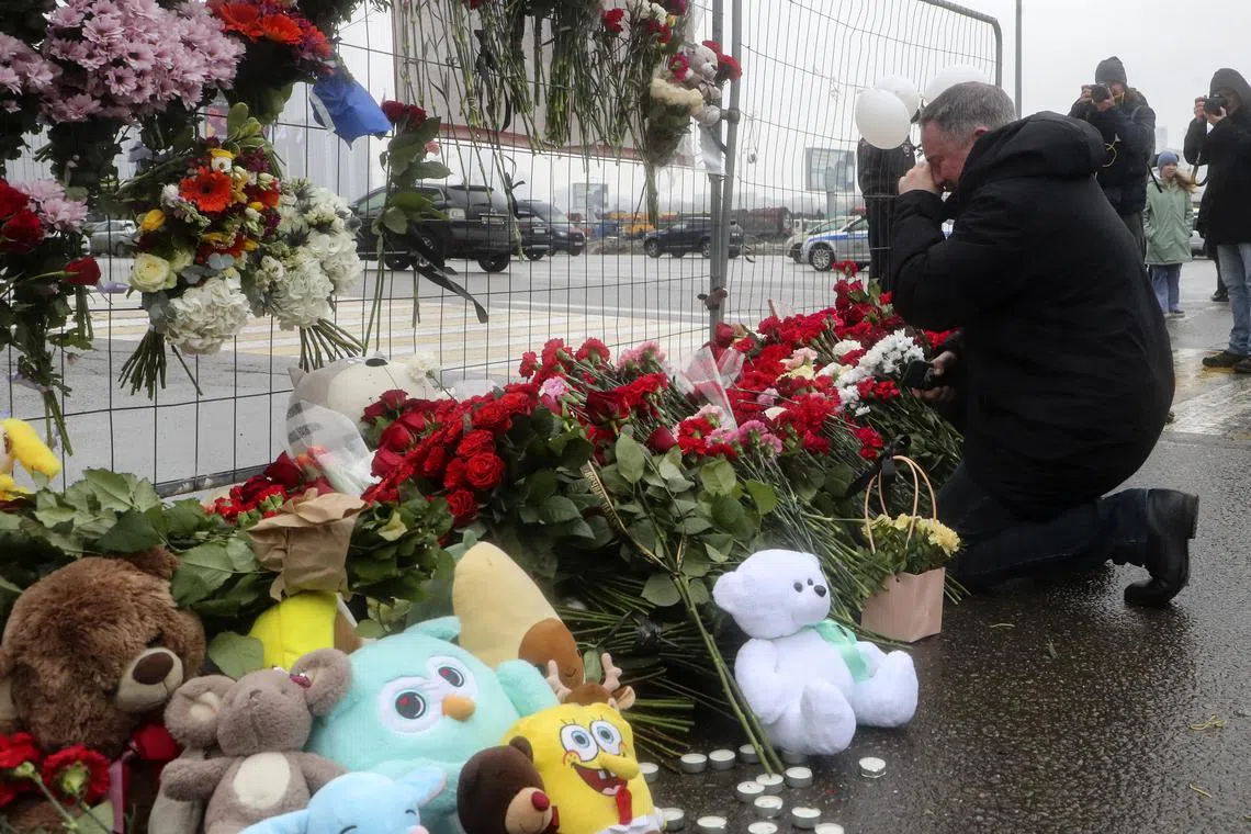 People mourning at the Crocus City Hall concert venue following a terrorist attack in Krasnogorsk, outside Moscow, on March 23.