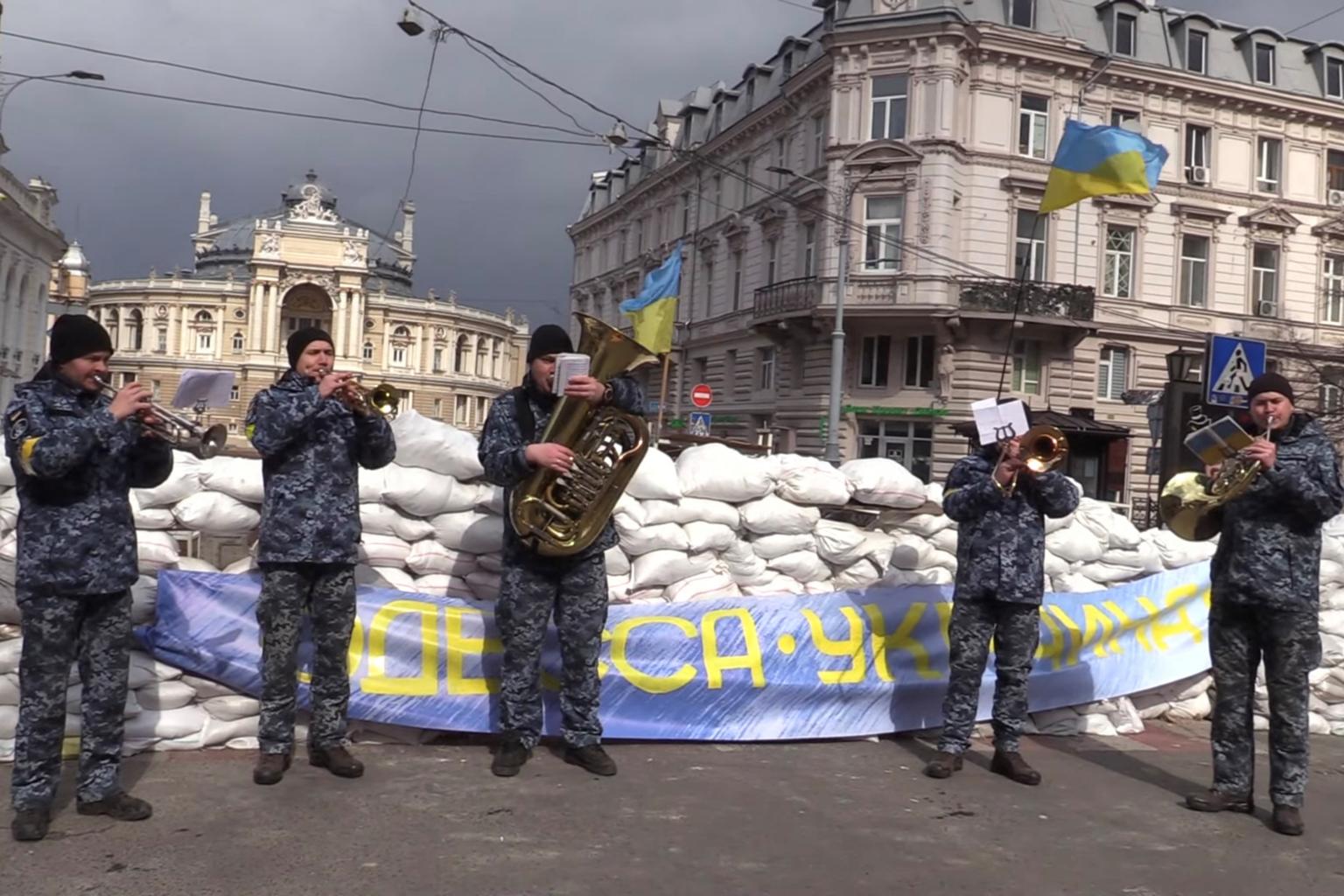 The defiance is written in the giant blue and yellow banner "Odessa-Ukraine" draped atop the sandbags in the near-deserted city centre, and even music has been pressed into the national cause of raising morale.