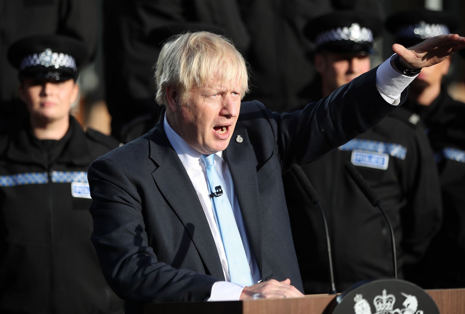 British Prime Minister Boris Johnson gives a speech during a visit to West Yorkshire, England.