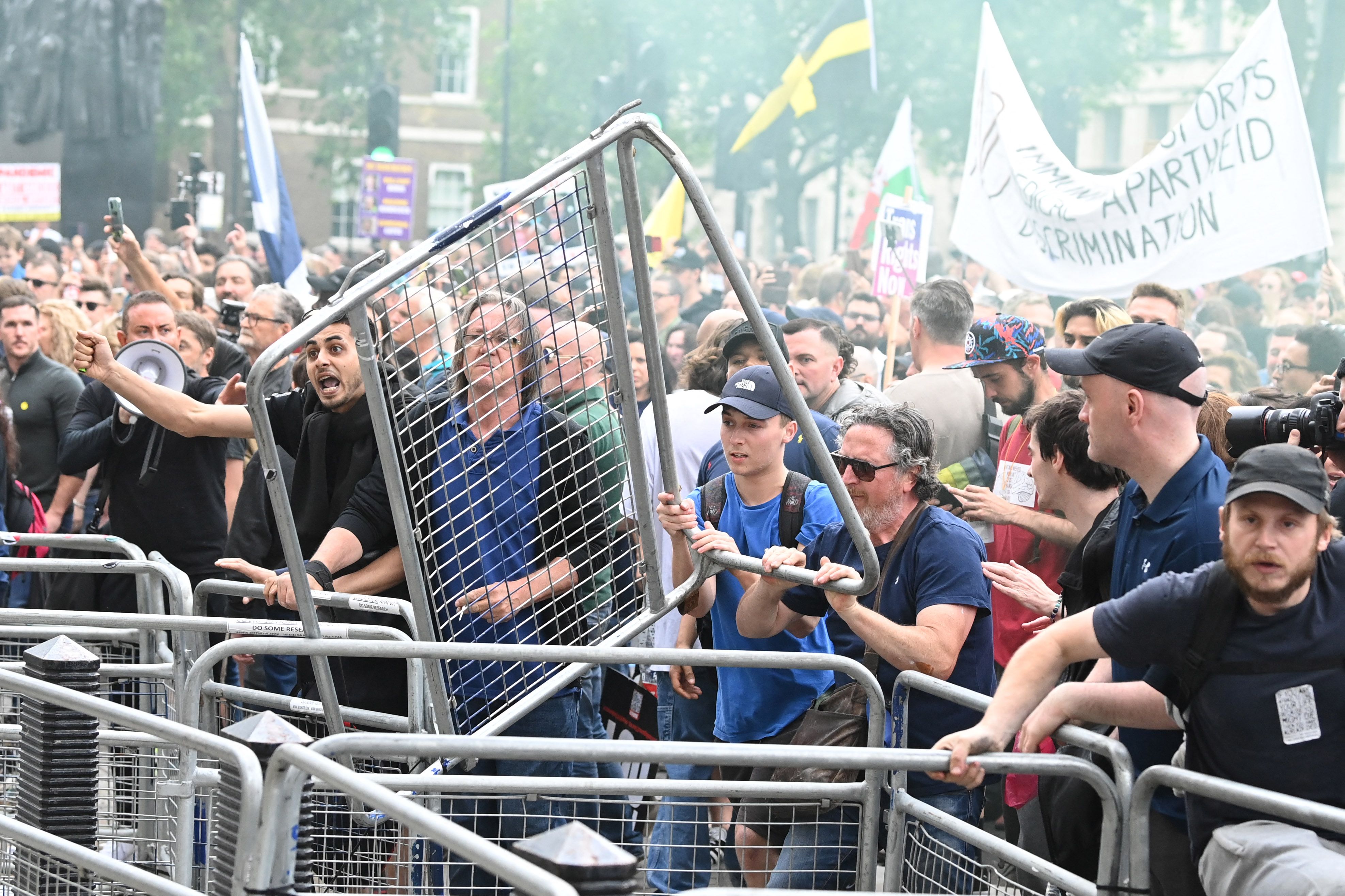 People throw fencing during an anti-vaccine and anti-lockdown demonstration outside London's Downing Street, on June 26, 2021.