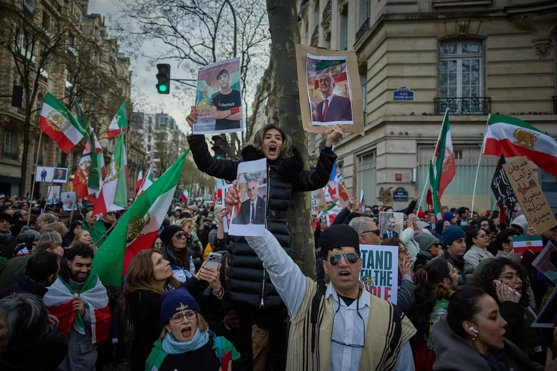 In Paris, more than 2,000 people waving Iran’s flag from before the Islamic Revolution in 1979 demonstrated, to chants of “No to the terrorist Islamic Republic”.