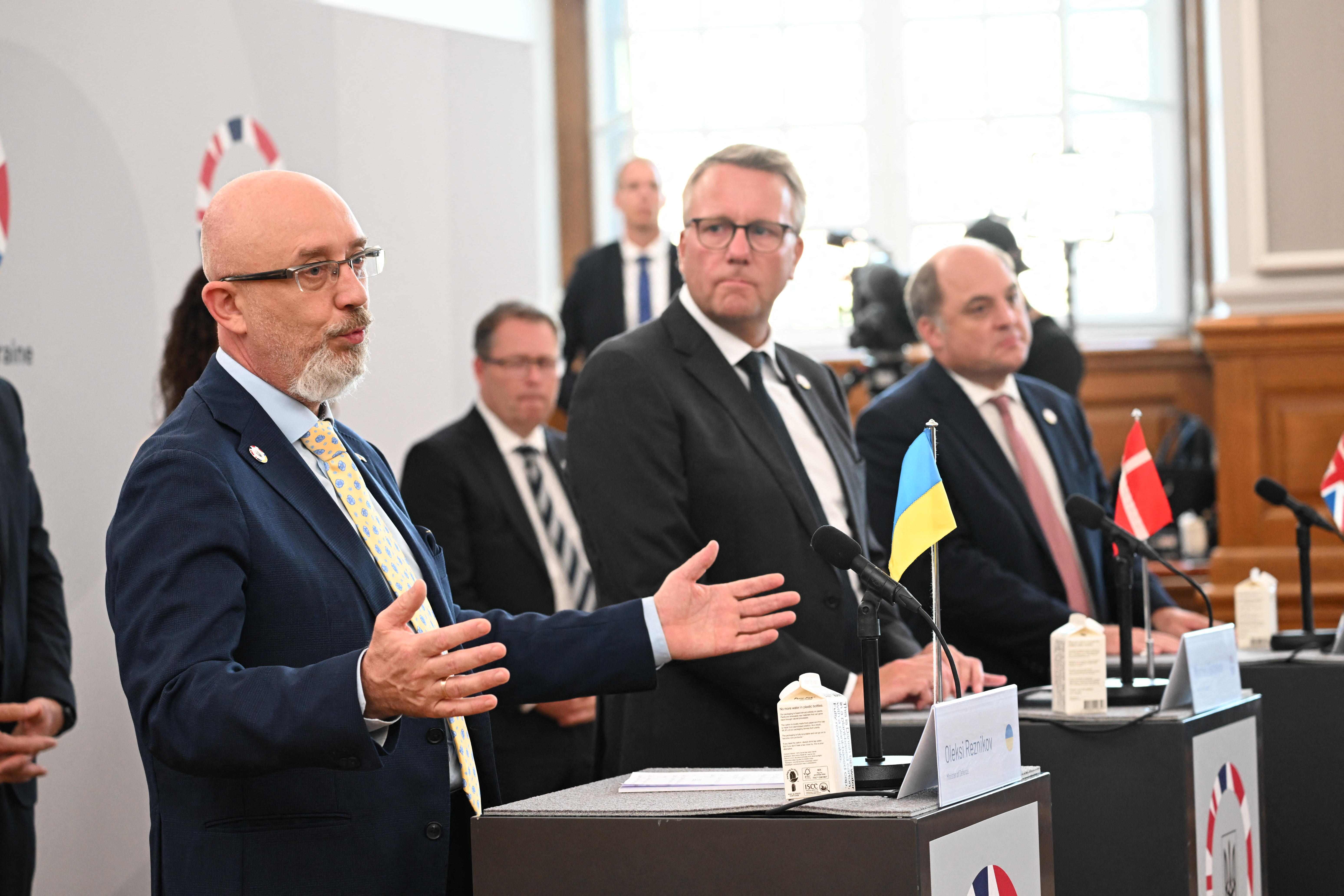 (From left) Ukrainian Defence Minister Oleksii Reznikov speaks at a media briefing in Copenhagen, with Danish Defence Minister Morten Bodskov and British Defence Secretary Ben Wallace.