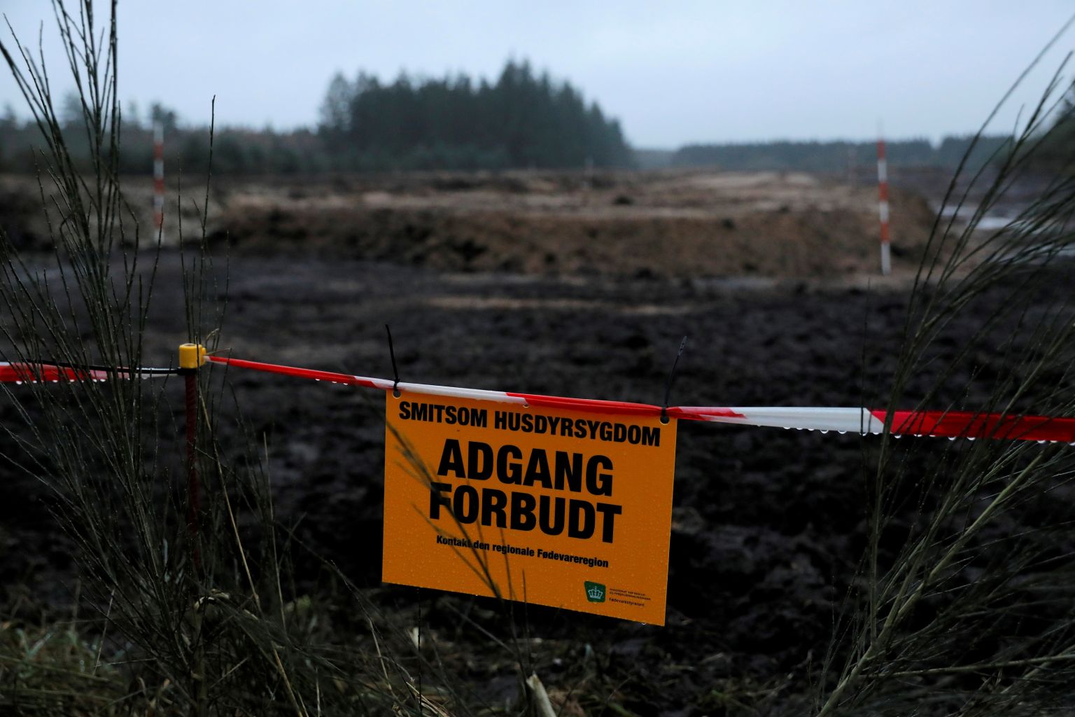 A sign prohibiting entry hangs by burial pits that contain culled mink in Karup, Denmark, in December 2020.