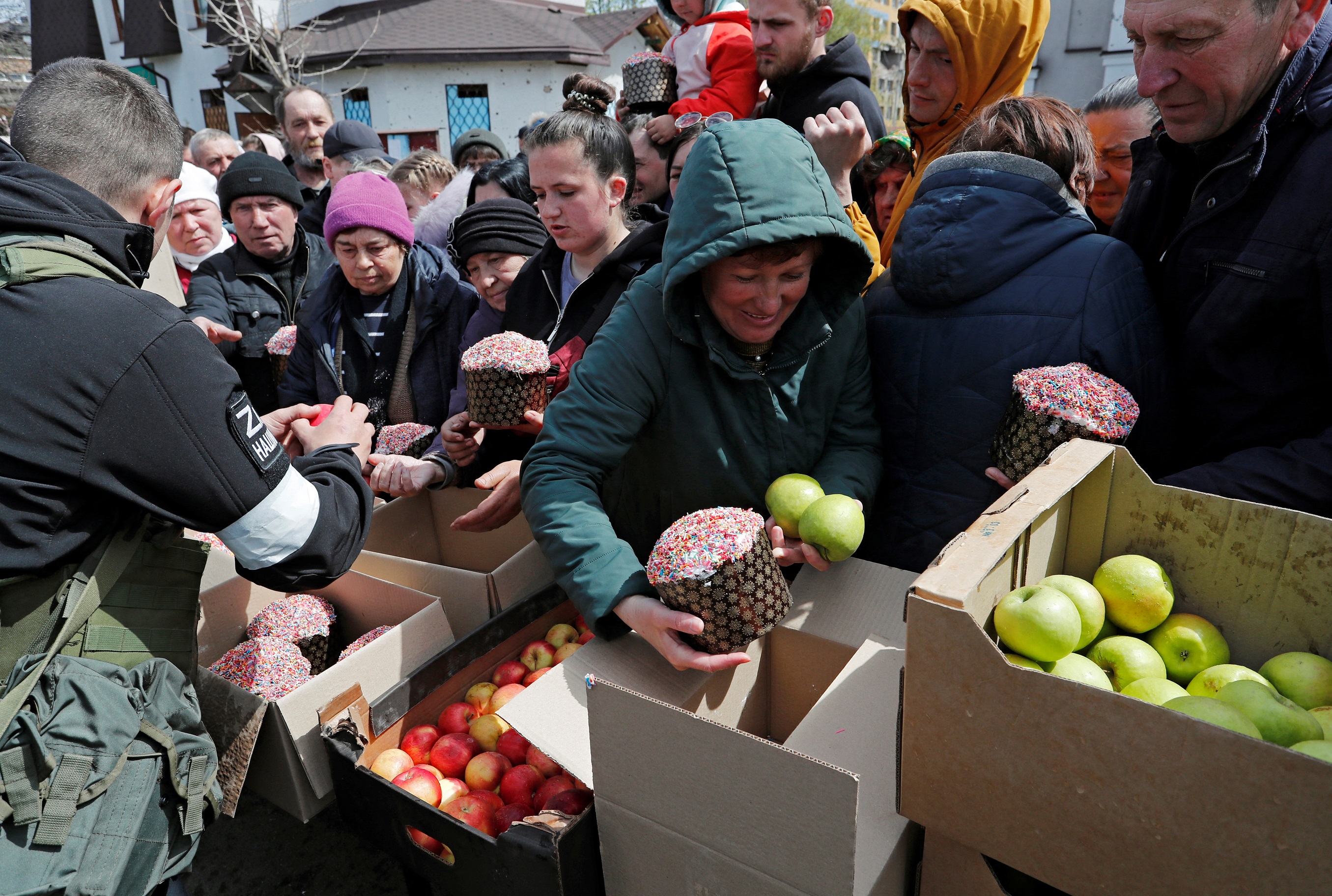Pro-Russian troops hand out food to Mariupol residents, on April 24, 2022.