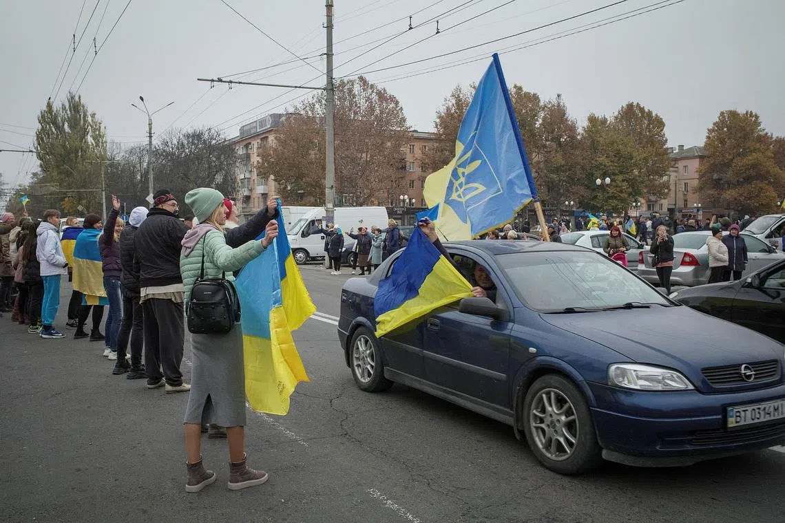 Residents celebrating the city’s liberation by Ukrainian forces in Kherson, Ukraine, on Nov 12, 2022.