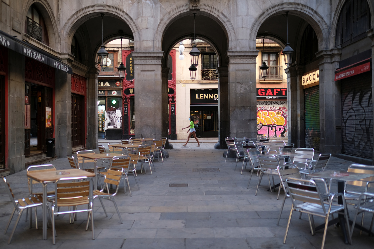 Empty terraces of bars at Plaza Reia in Barcelona on Aug 7, 2020.