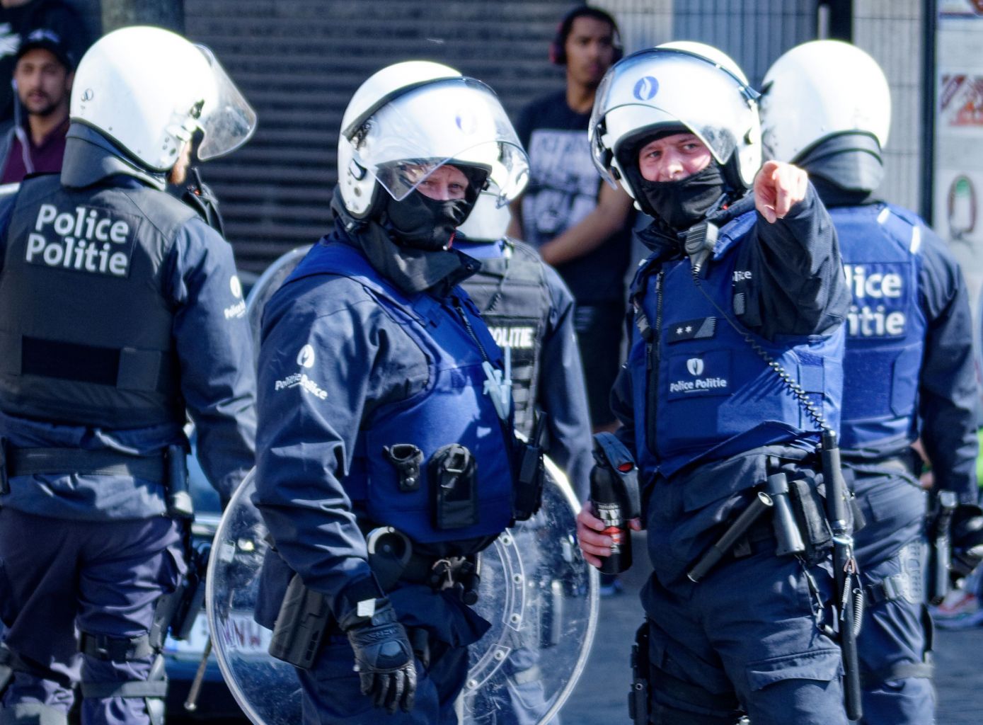 Belgian police offiers wearing protective gear stand at the site of unrest in Anderlecht, Brussels, on April 11, 2020.