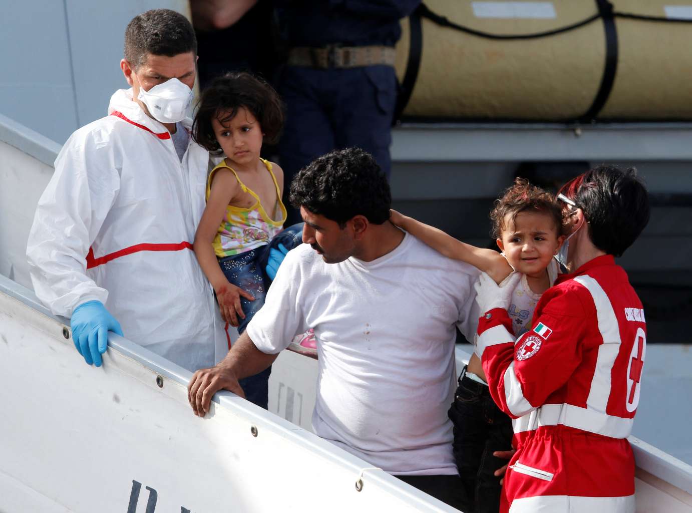 Migrants are helped as they disembark from Italian navy ships in the Sicilian harbour of Porto Empedocle, Italy, May 26, 2016.
