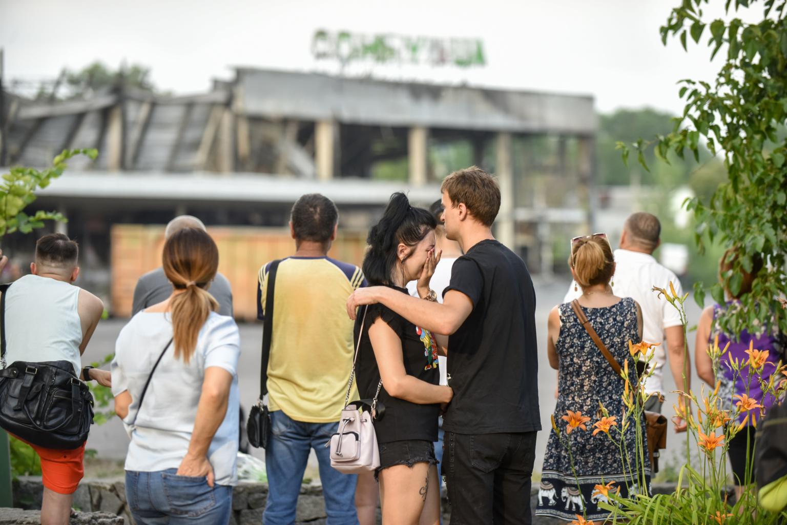 People react emotionally near destroyed Amstor shopping mall in Kremenchuk, Ukraine, on June 28, 2022.