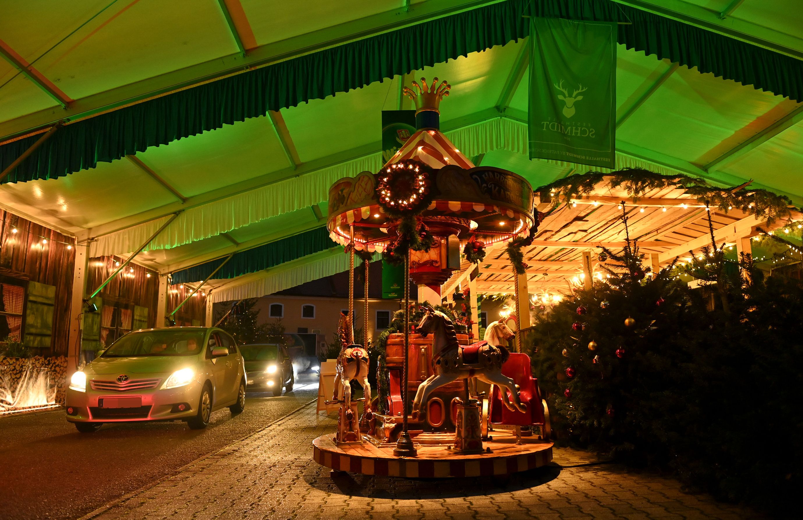 Every night after dark, several dozen vehicles roll into the Christmas market drive-in, their occupants cosy and socially distanced inside.