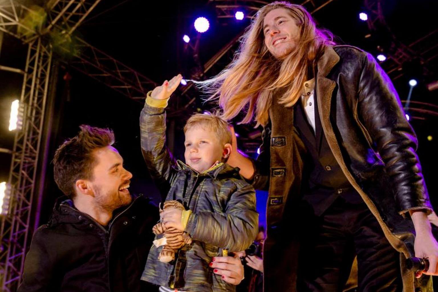 Dutch 3FM DJ's Domien Verschuuren (left) and Frank van der Lende stand alongside Tijn Kolsteren, six, during a fund-raising event in Breda, the Netherlands, on Dec 24, 2016.