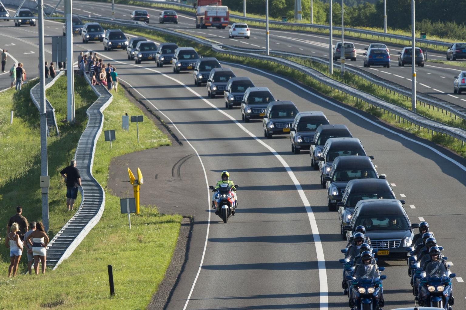 In a photo from July 23, 2014, a row of hearses carrying MH17 victims are escorted by military police in Hilversum.