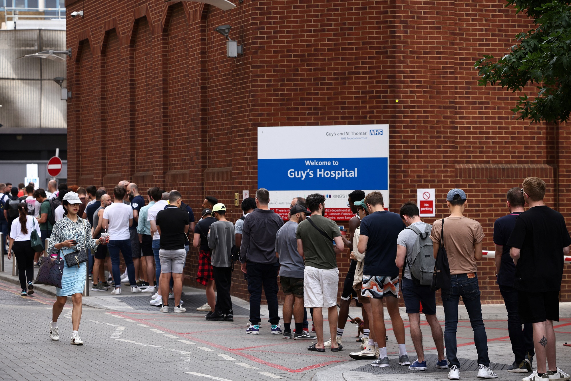People queue to receive monkeypox vaccinations, from a pop-up clinic at Guy's Hospital in London, on July 30, 2022.