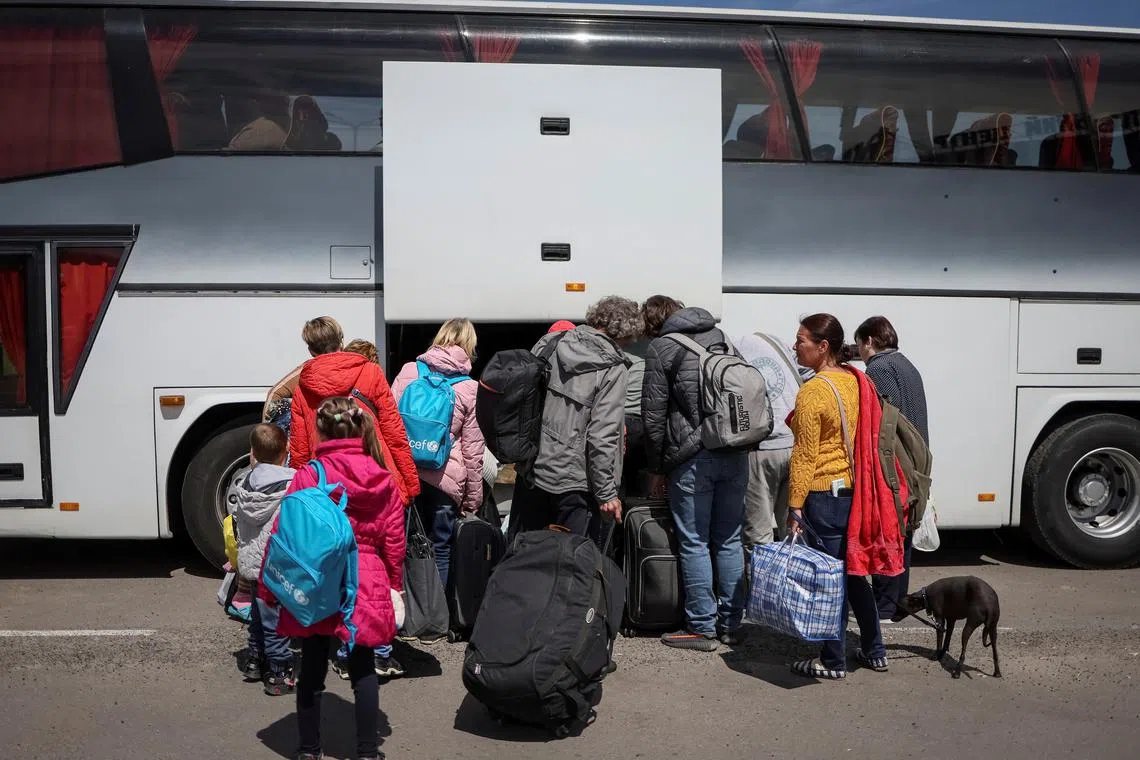 Ukrainian refugees from Mariupol region board a bus bound for Poland at a registration and humanitarian aid center for internally displaced people in May 2022.