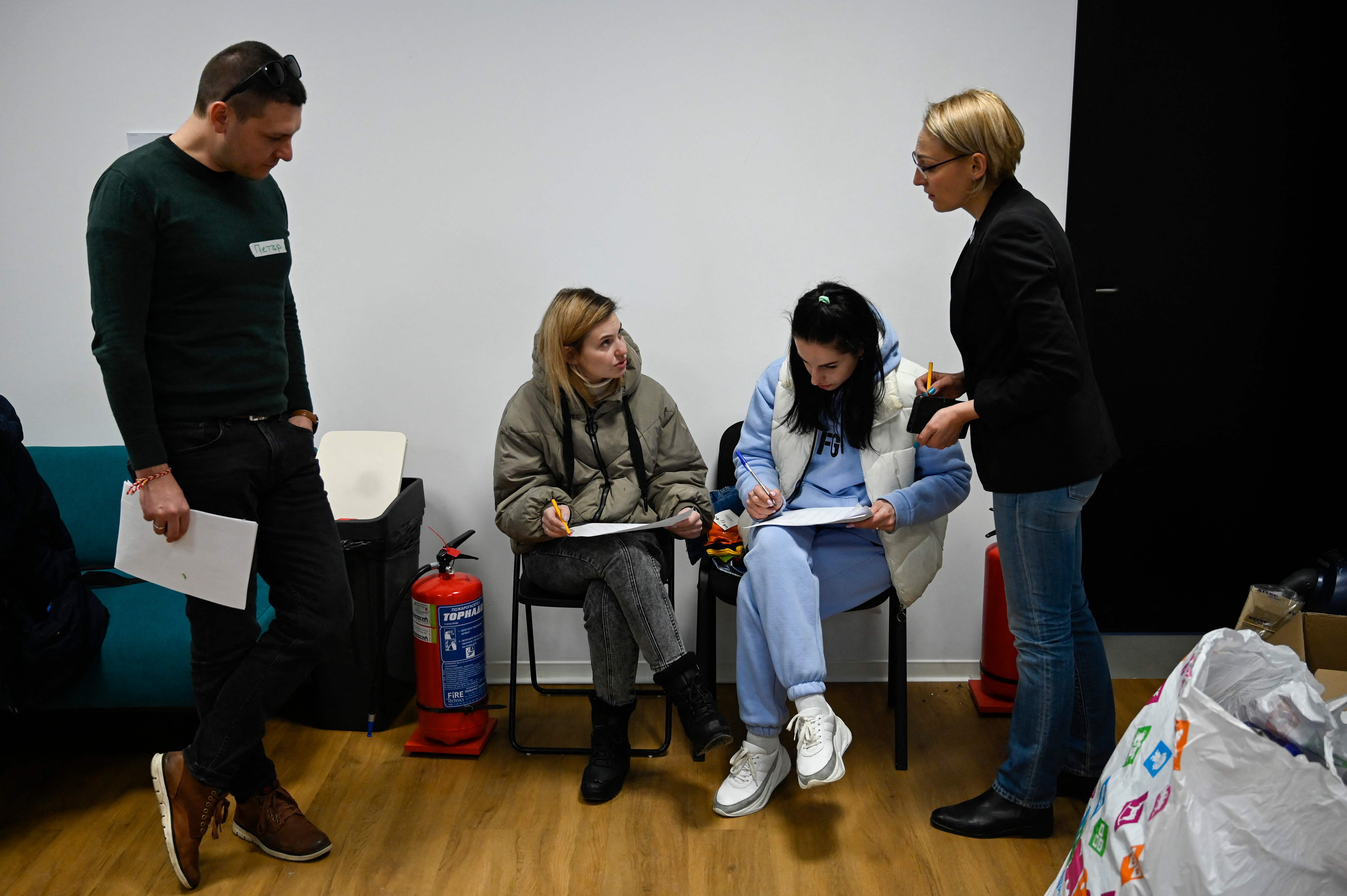 Volunteers help Ukrainian refugees to get registered in a situation centre for people affected by the war in Ukraine, in Sofia on March 11, 2022.