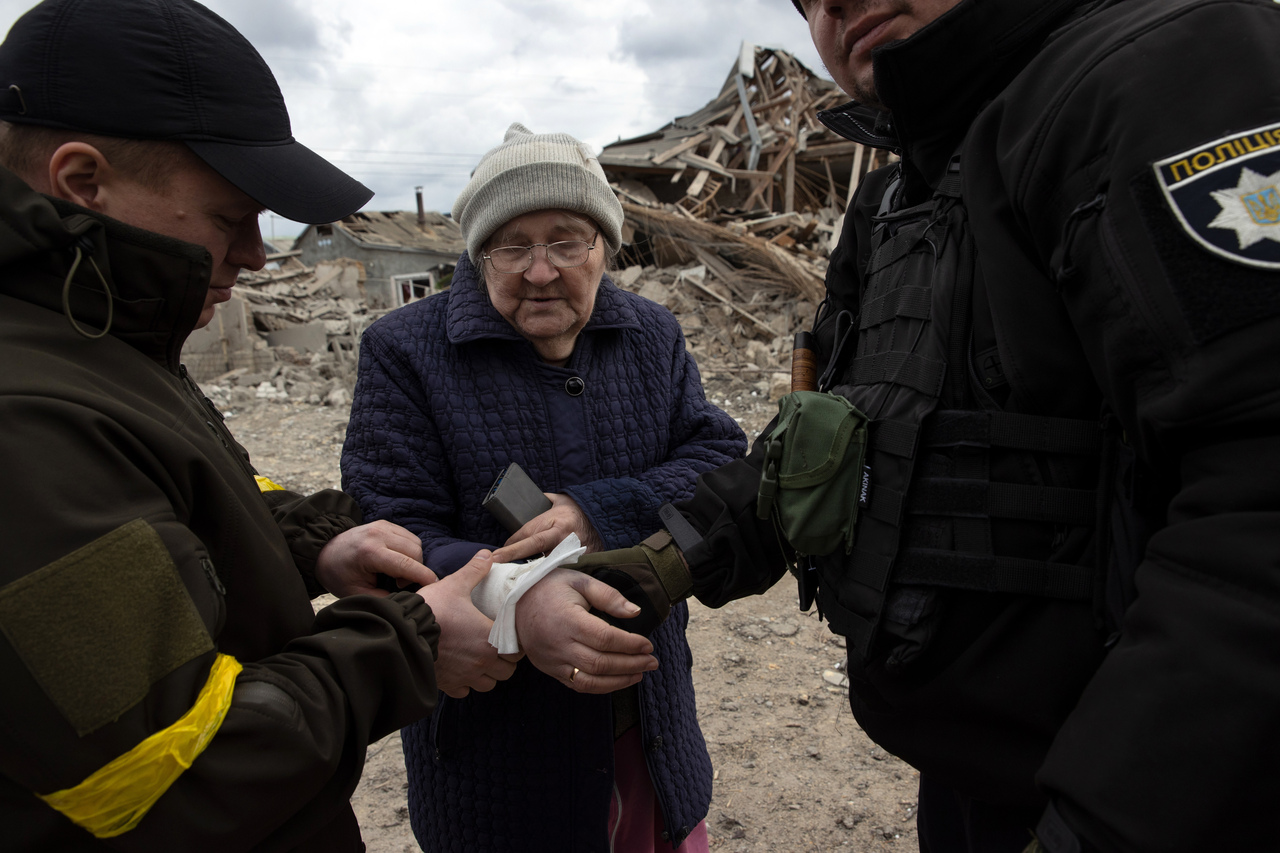 An elderly woman's arm is bandaged after an attack by Russian forces in Mykolaiv, Ukraine, on March 8, 2022.