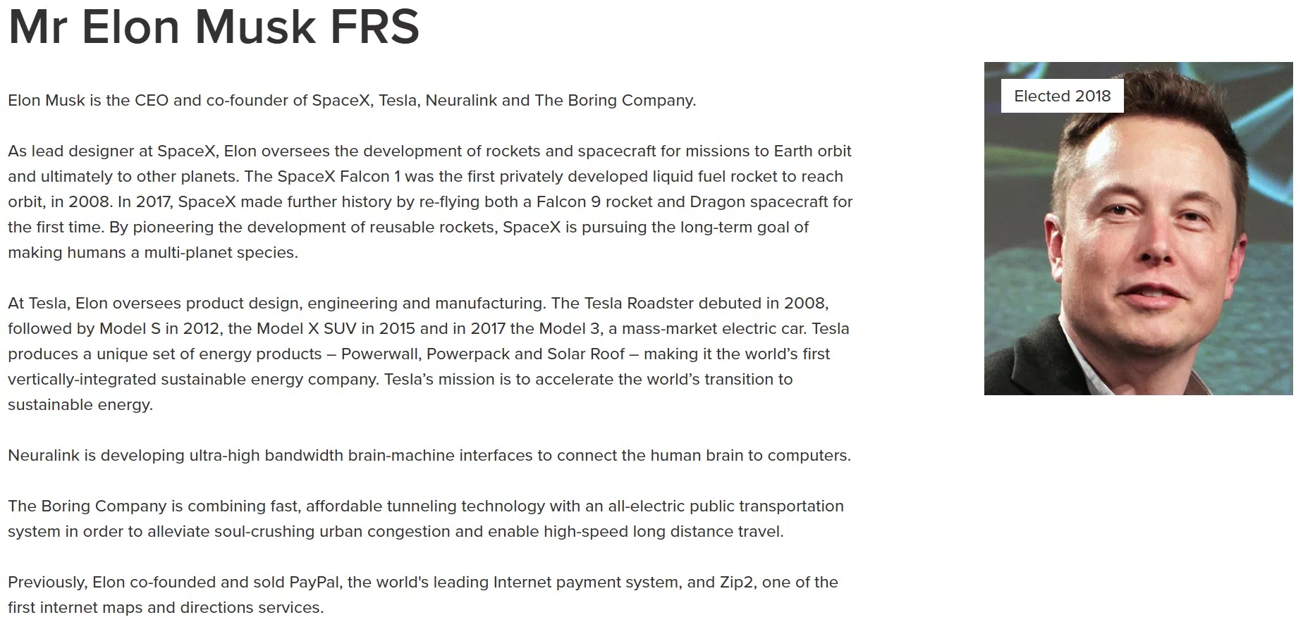 Billionaire Elon Musk’s profile still stands on the Royal Society’s website.