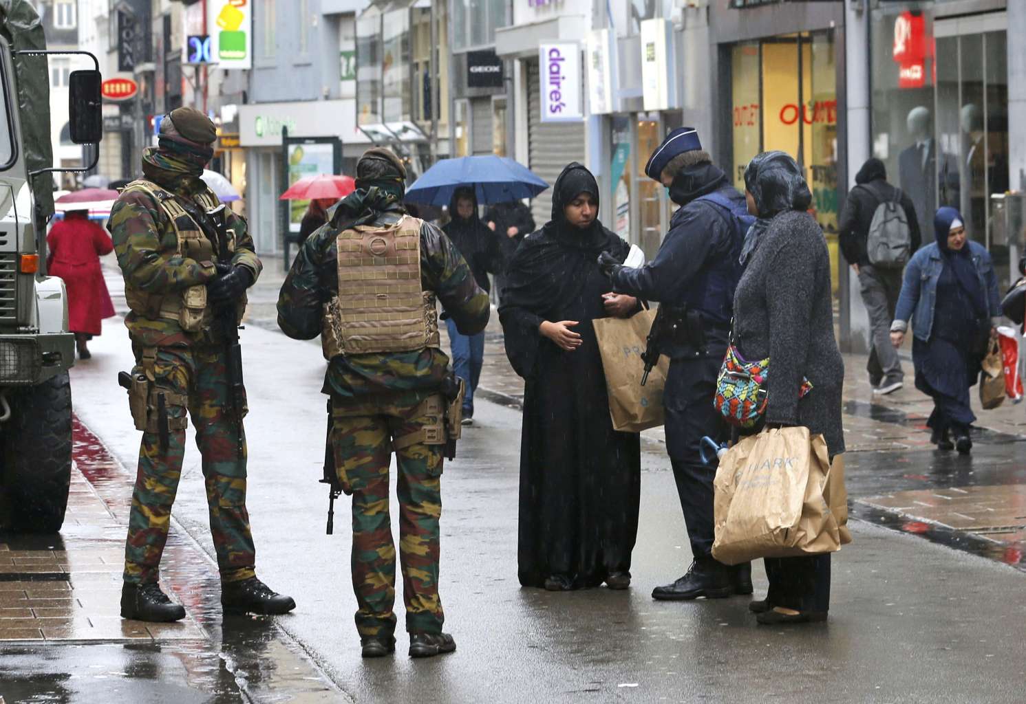 Belgian soldiers and a police officer control the documents of a woman in a shopping street in central Brussels.