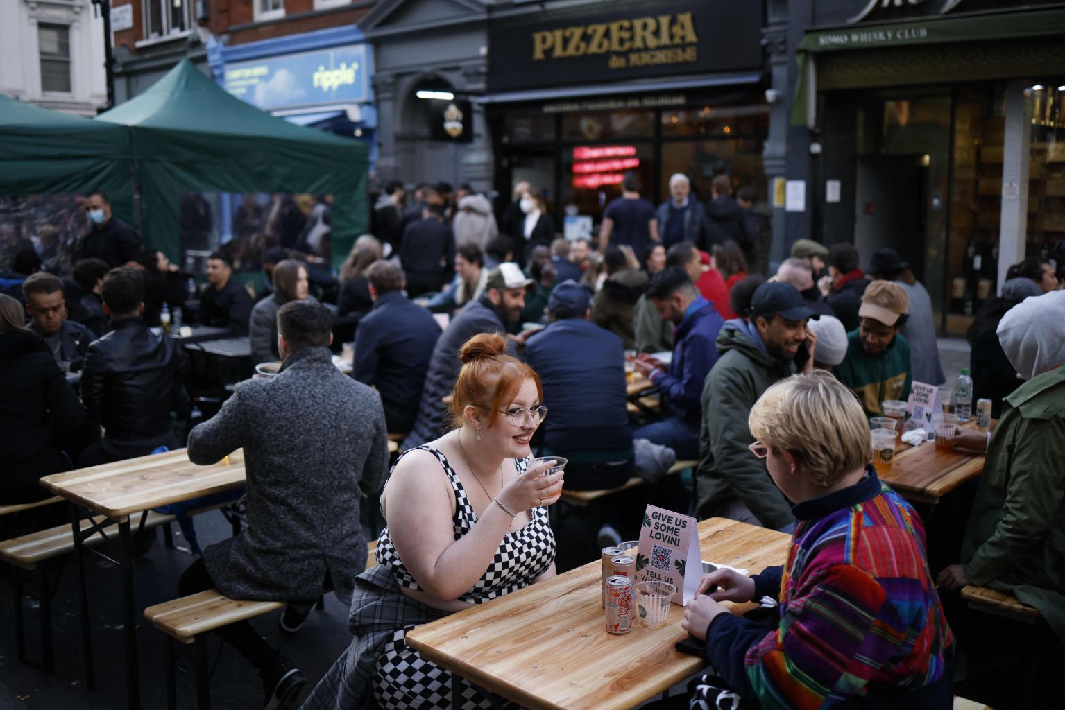 Customers enjoy drinks at tables outside the bars in the Soho area of London, on April 12, 2021.