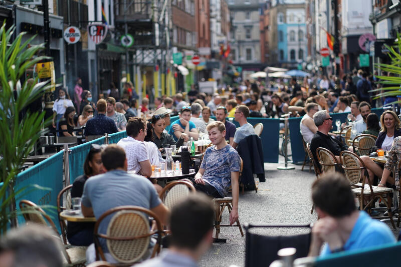 People sit at tables outside restaurants in London's Soho, on Sept 20, 2020.