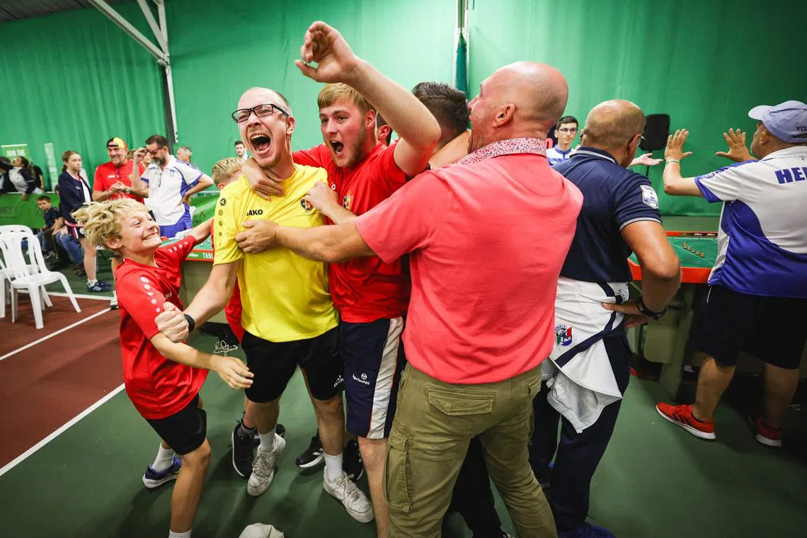 Junior players and coaches from Belgium celebrating winning their match during the Subbuteo World Cup in England on Sept 22.