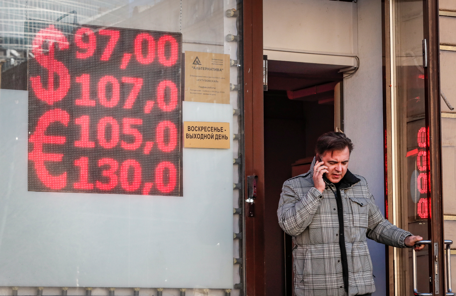 A man leaves an exchange office with a screen showing the currency exchange rates of US dollar and euro to Russian rouble in Moscow, on March 2, 2022.
