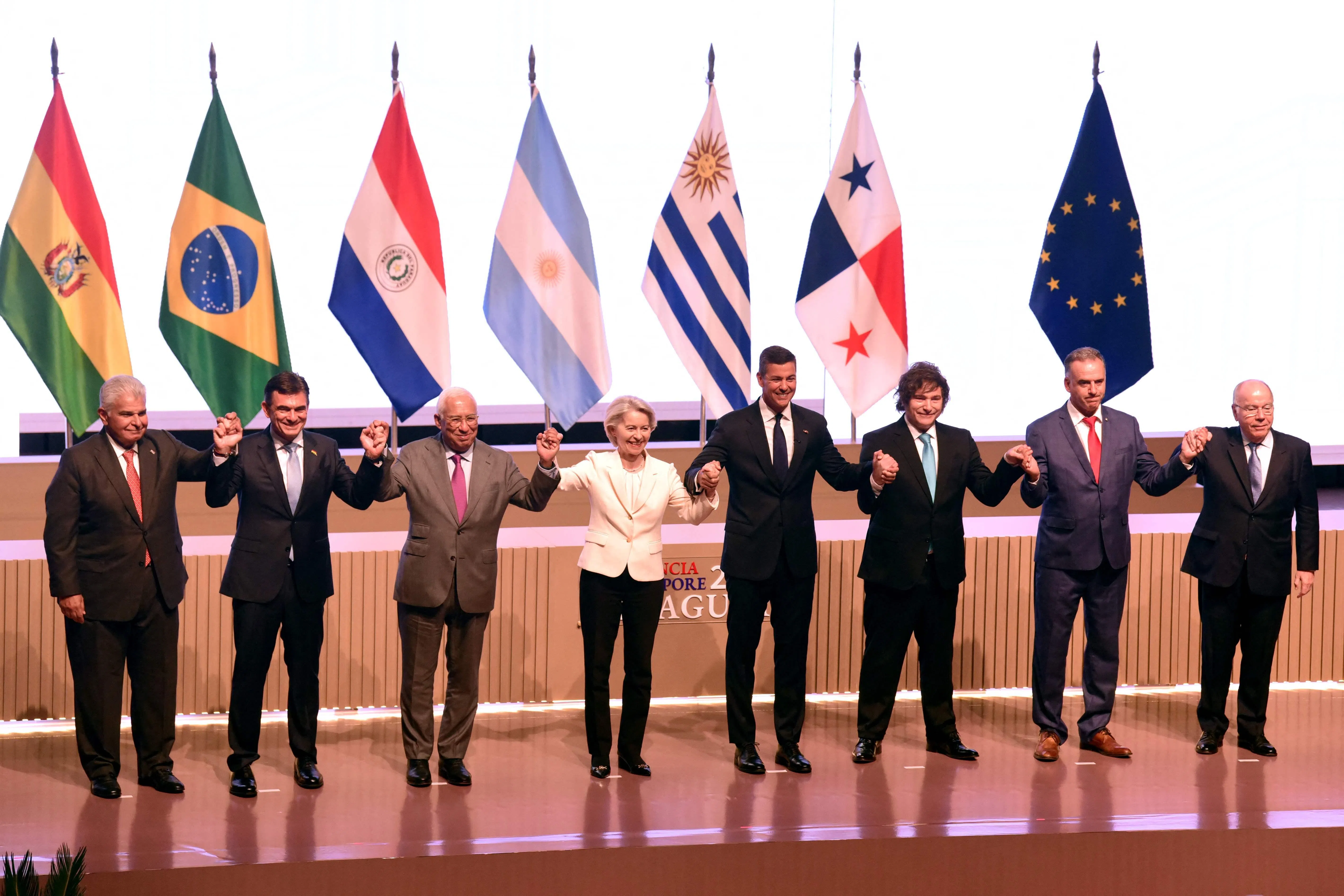 Paraguay’s President Santiago Pena also praised the treaty as sending “a clear signal in favour of international trade” in “a global scenario marked by tensions”.