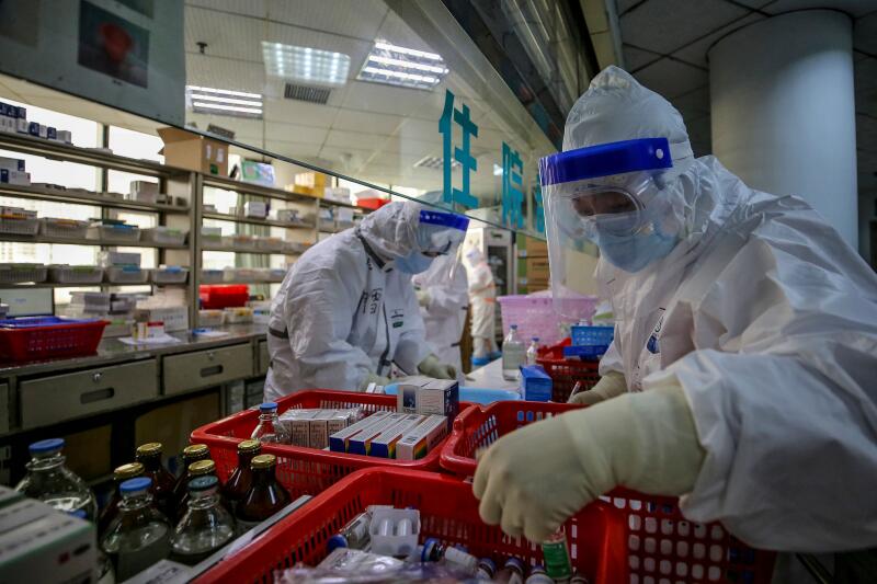 Medical staff arrange medicine at Red Cross Hospital in Wuhan on March 10, 2020.
