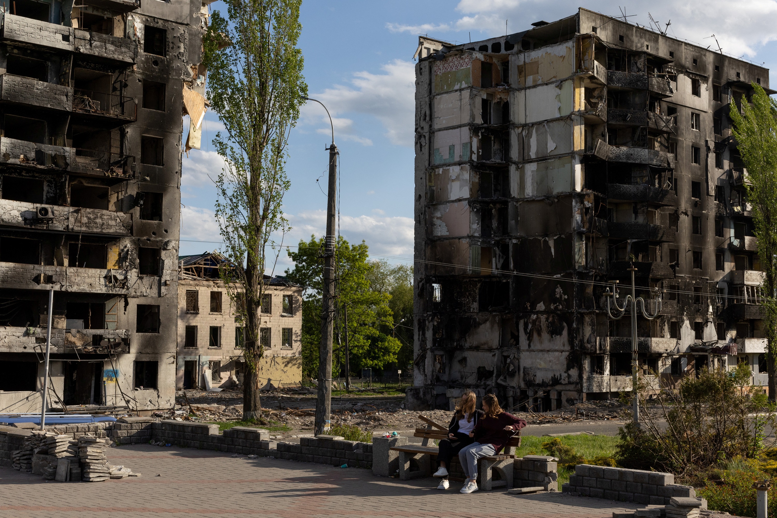 Two girls sit in a public square, in front of destroyed buildings, in Borodyanka, outside Kyiv, on May 16, 2022.