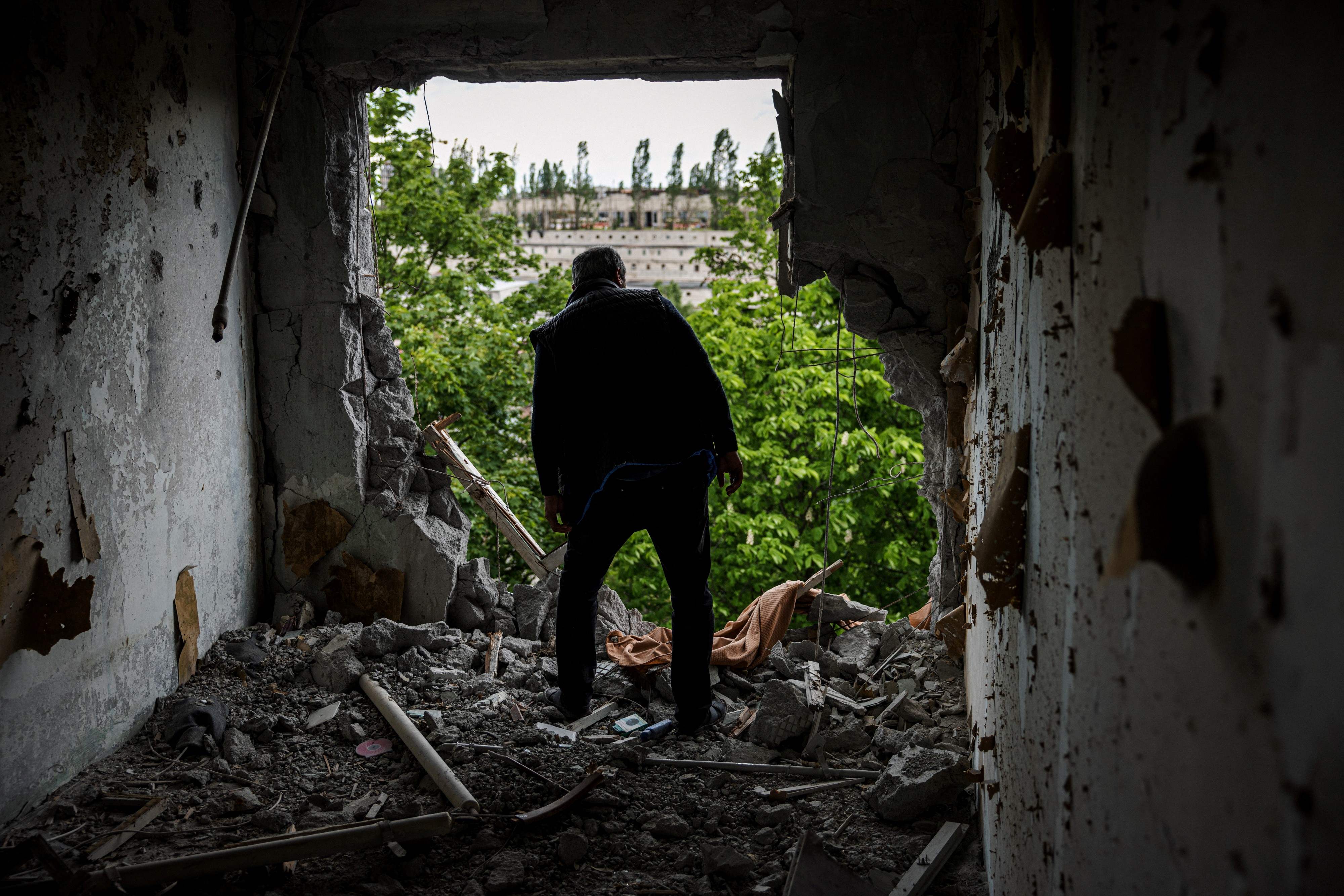 A man looks out of his apartment, damaged by shelling, in the Saltivka district of northern Kharkiv, on May 15, 2022,