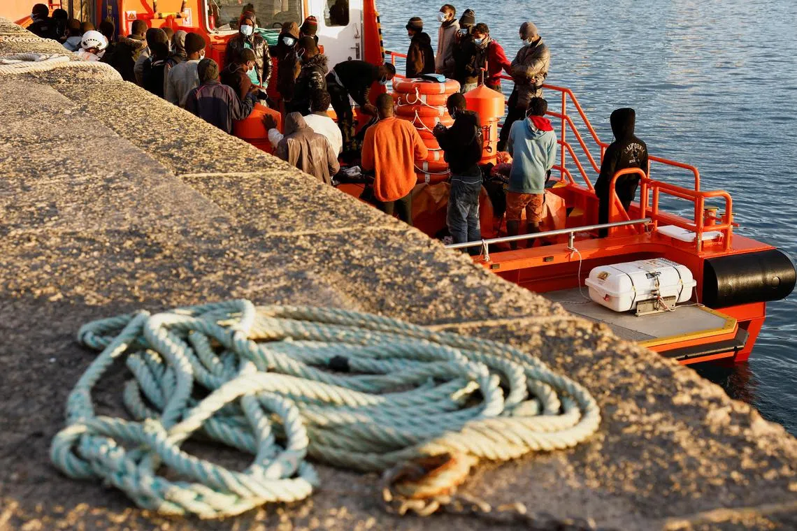 Migrants wait to disembark at a port in Spain, after being picked up by the Spanish coast guard, on Jan 31, 2023.