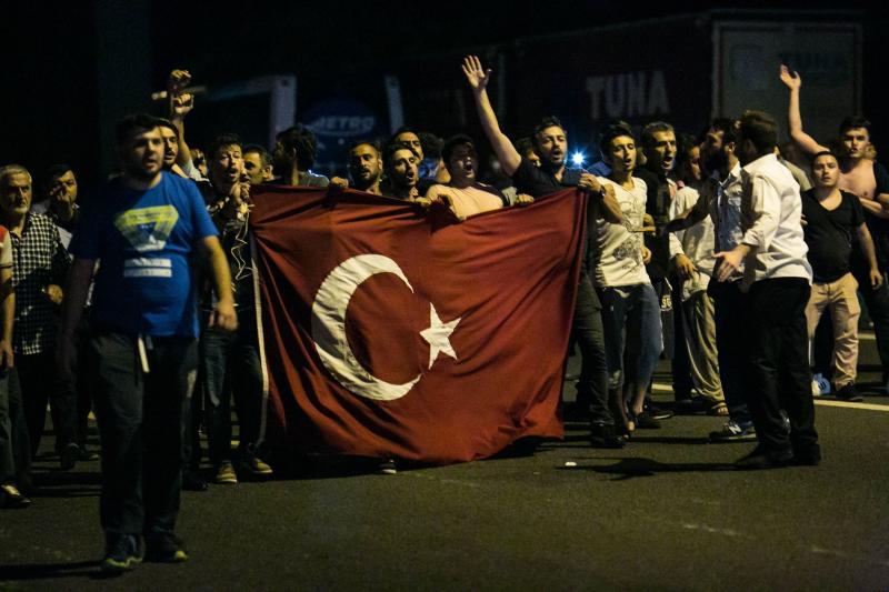 People shouting slogans as they carry a flag on a street near the Fatih Sultan Mehmet Bridge during clashes with military forces in Istanbul, on July 15, 2016.