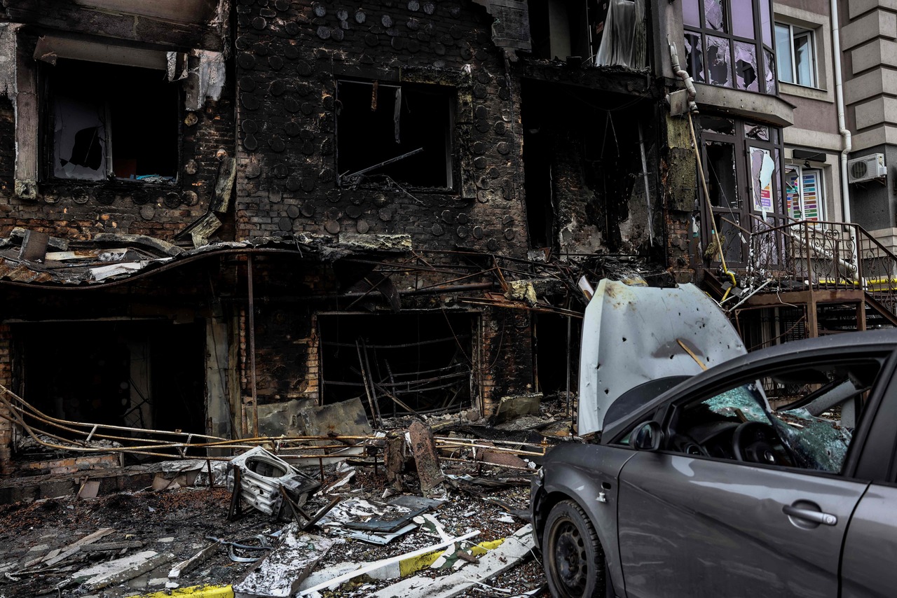 A destroyed building is seen in the town of Bucha, where Russian troops allegedly executed unarmed civilians.