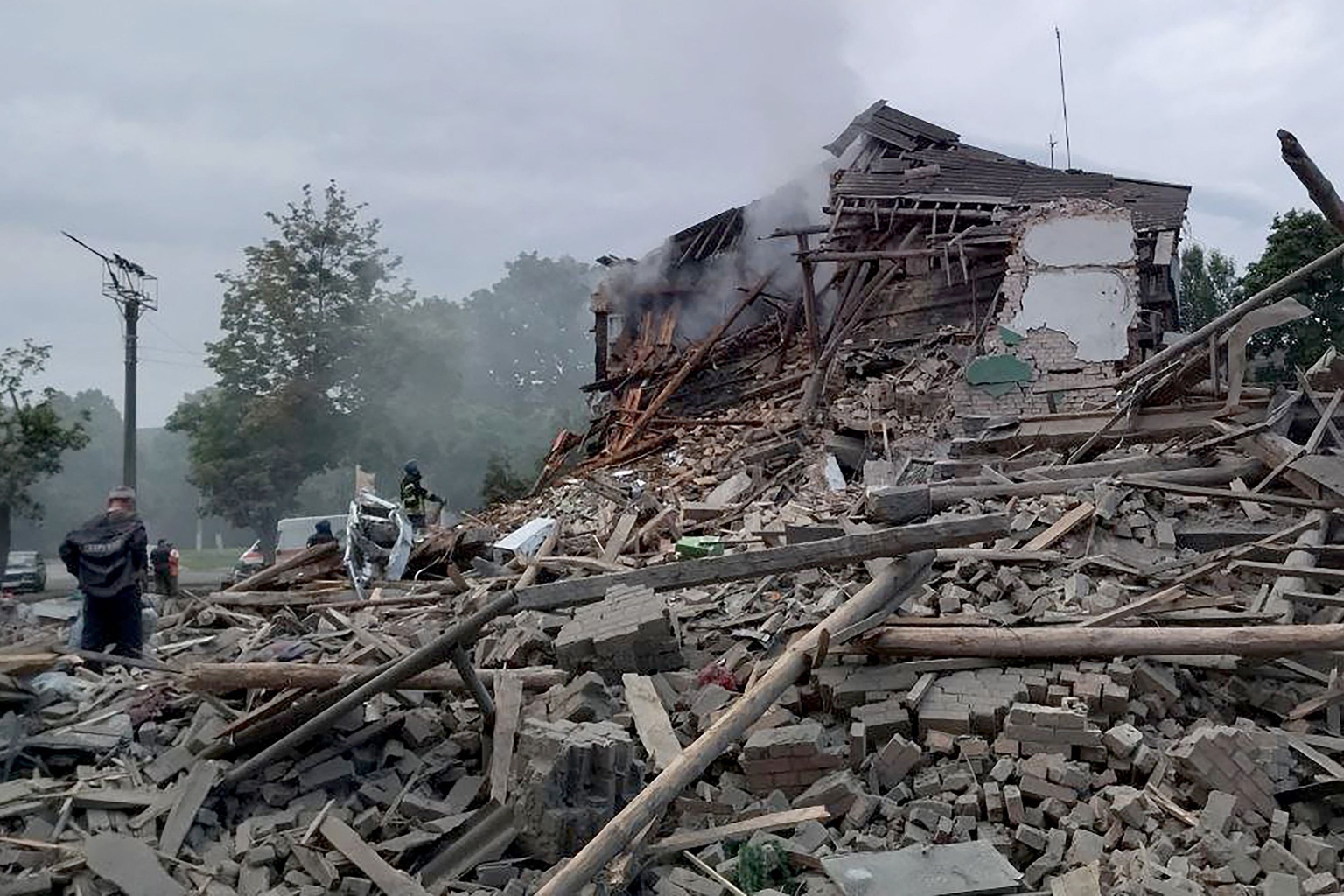 Firefighters removing rubble from a destroyed building after a missile strike in the city of Nikopol, on July 16, 2022.