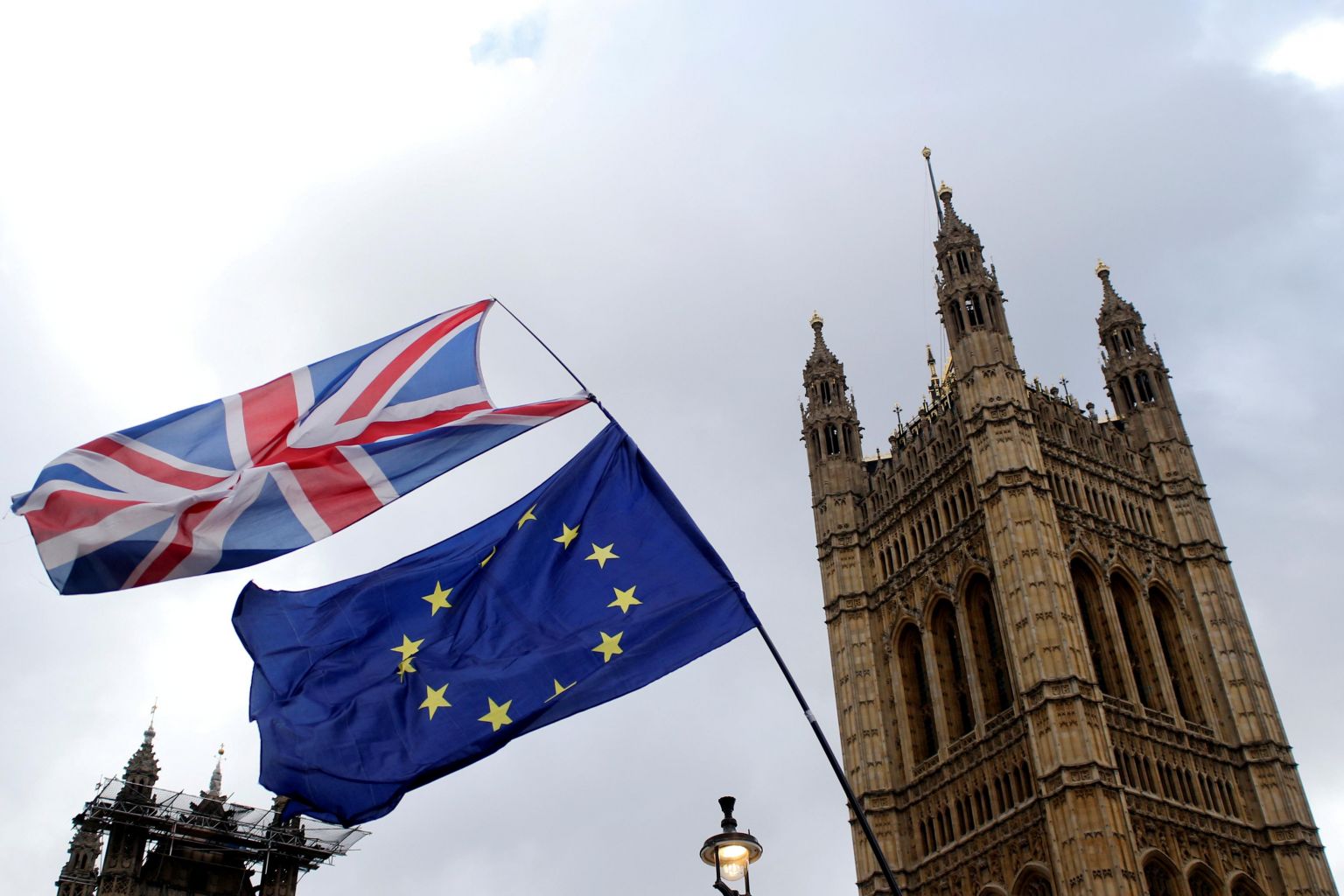 Flags flutter outside the Houses of Parliament, ahead of a Brexit vote, in London, Britain, on March 13, 2019.