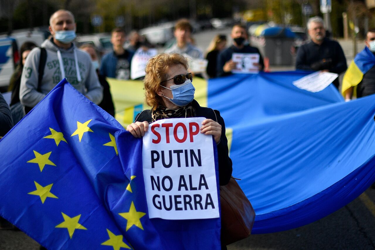 People holding EU and Ukraine flags protesting against Russia's military operation in Ukraine, in front of the Russian consulate in Barcelona, Spain, on Feb 24, 2022.
