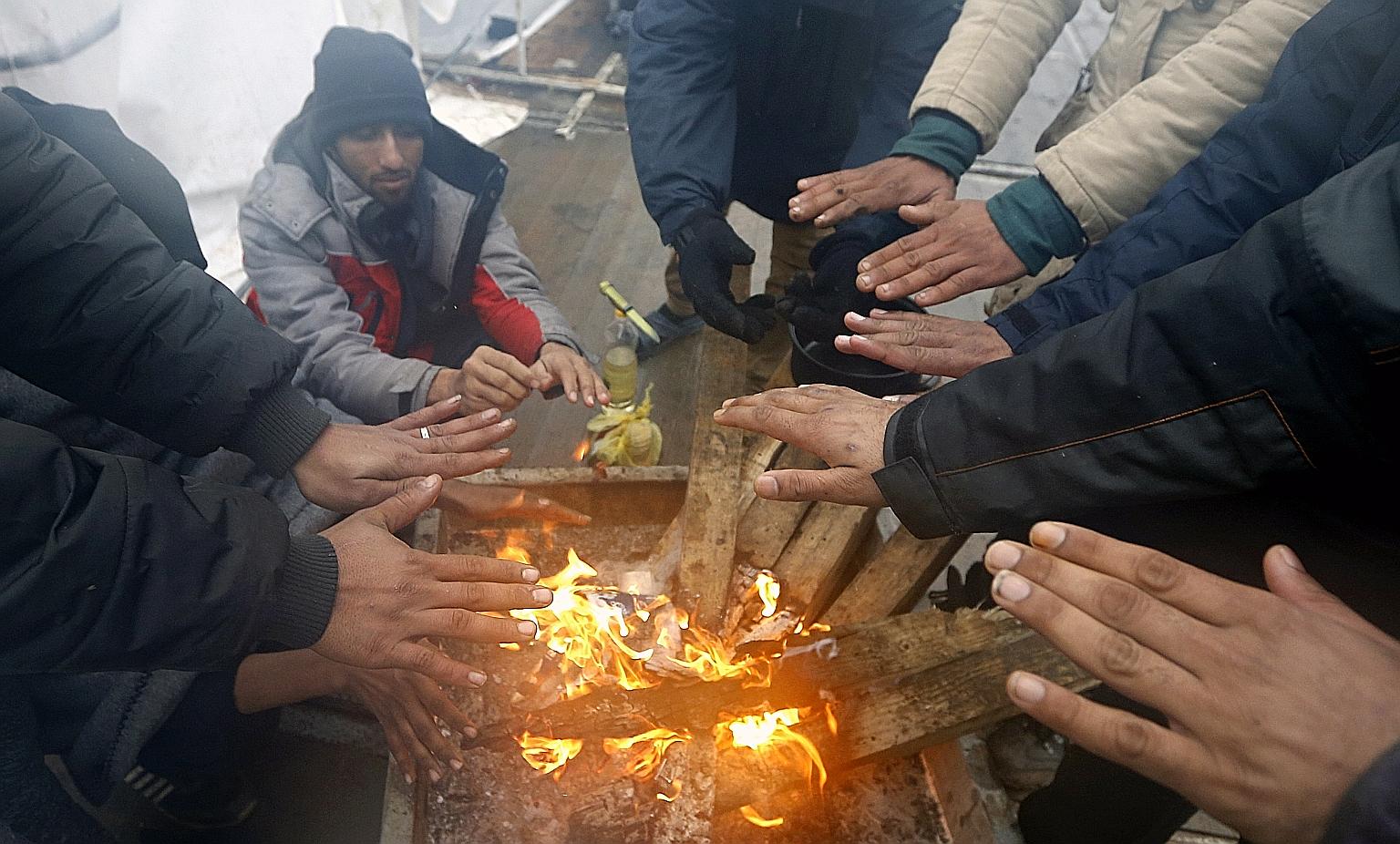 Migrants warding off the winter cold by gathering around a fire at the Lipa camp site in Bosnia on New Year's Day. EU foreign policy chief Josep Borrell warned that 900 people were still exposed on the grounds of the destroyed camp, and that 800 more were without shelter in the region.