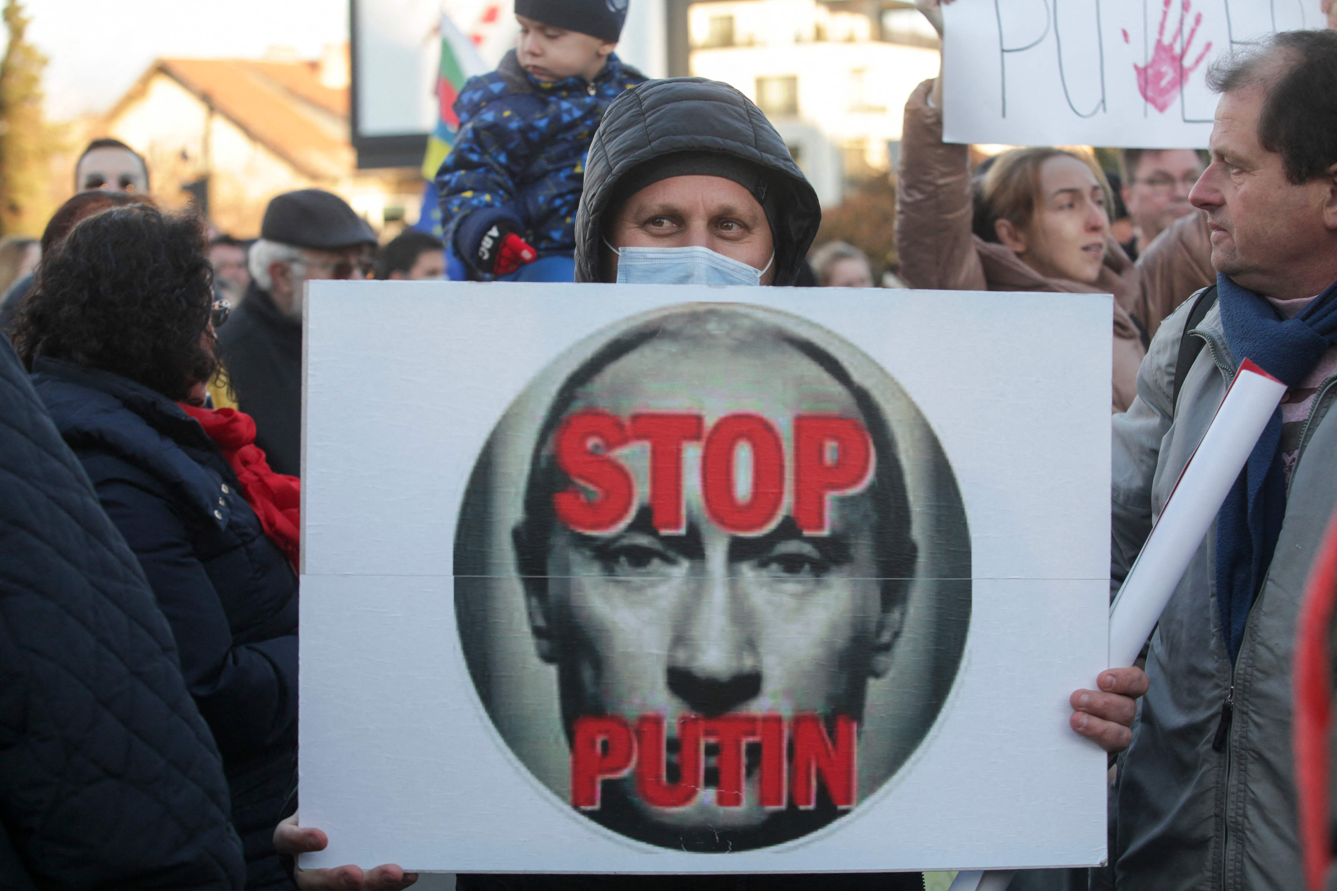 A demonstrator holds a banner during a rally in support of Ukraine in front of the Russian Embassy in Sofia, Bulgaria, on Feb 24, 2022.